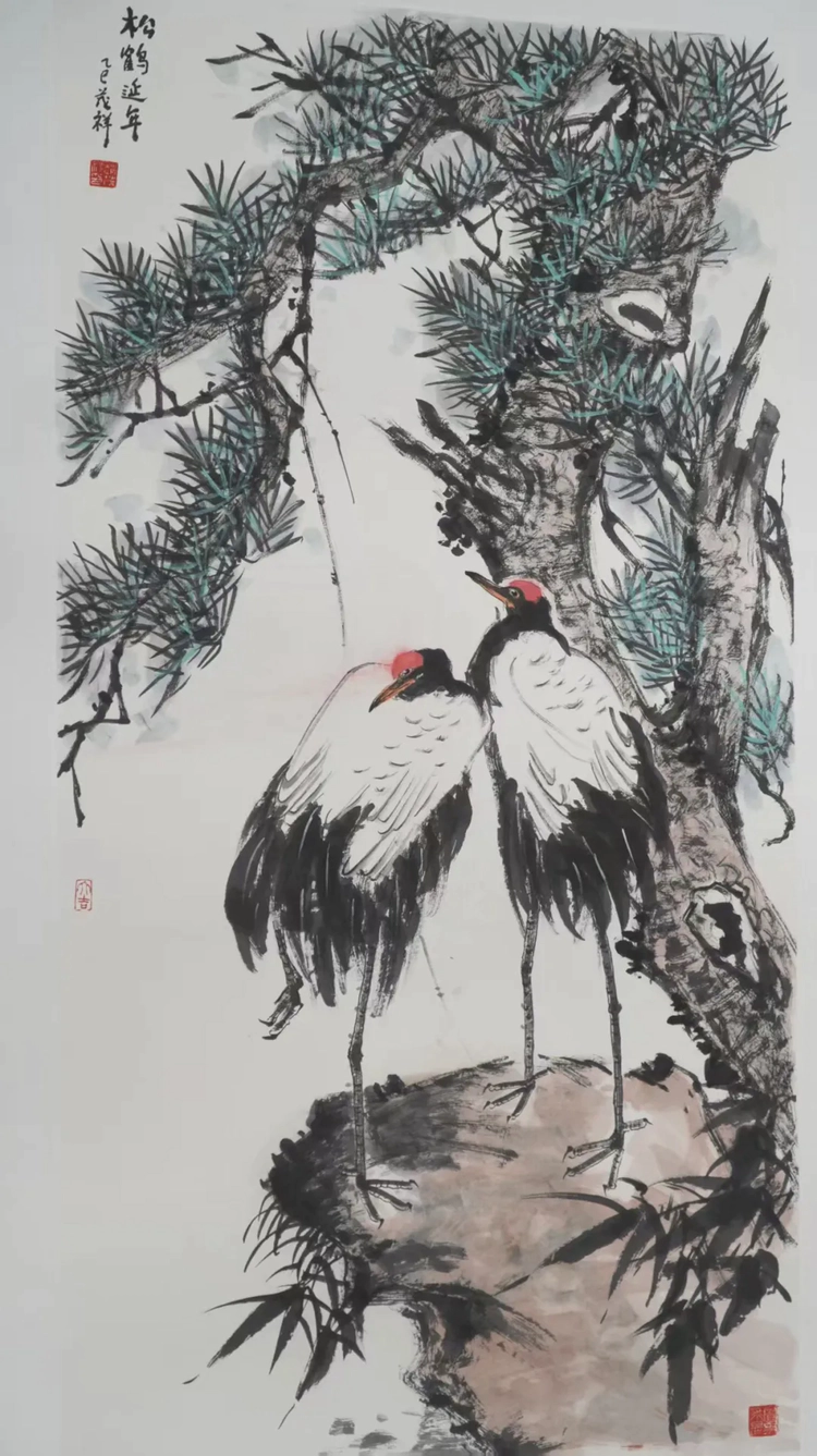 重阳节是我国重要的传统节日,承载着尊老、敬老、祈福、纳祥的深厚文化内涵。为弘扬中华民族优秀传统文化,倡导尊老爱幼的社会风尚,我为这次展览精心创作了两幅作品,一幅是《松树和仙鹤》,一副是《高山流水》,代表长寿。希望长辈们长寿健康,重阳节快乐!
