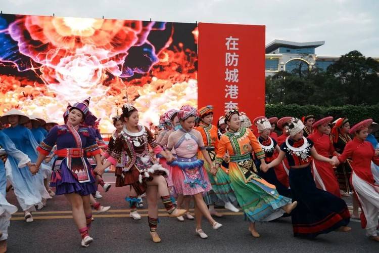 国际友城携手,东盟风情点亮赛道。防城港市相关领导、柬埔寨、越南等多国友好城市领导出席开幕式。此外,越南、缅甸、柬埔寨等东盟国家的运动员参与比赛。现场,身着民族服饰的演员们在起点主舞台载歌载舞,更有来自越南的艺术团体带来极具东南亚风情的传统歌舞表演。