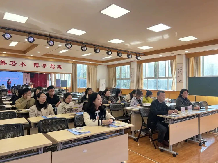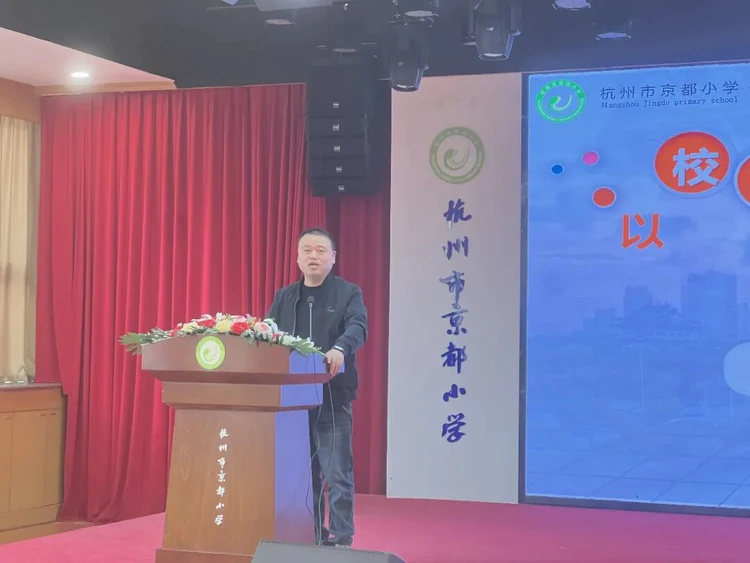 随后,来宾们来到二楼多媒体教室。洪俊校长以《运河文化引领学校高质量发展》为主题,向崇福实验小学的老师们详细介绍了学校的办学理念、德育文化、对外交流等情况。